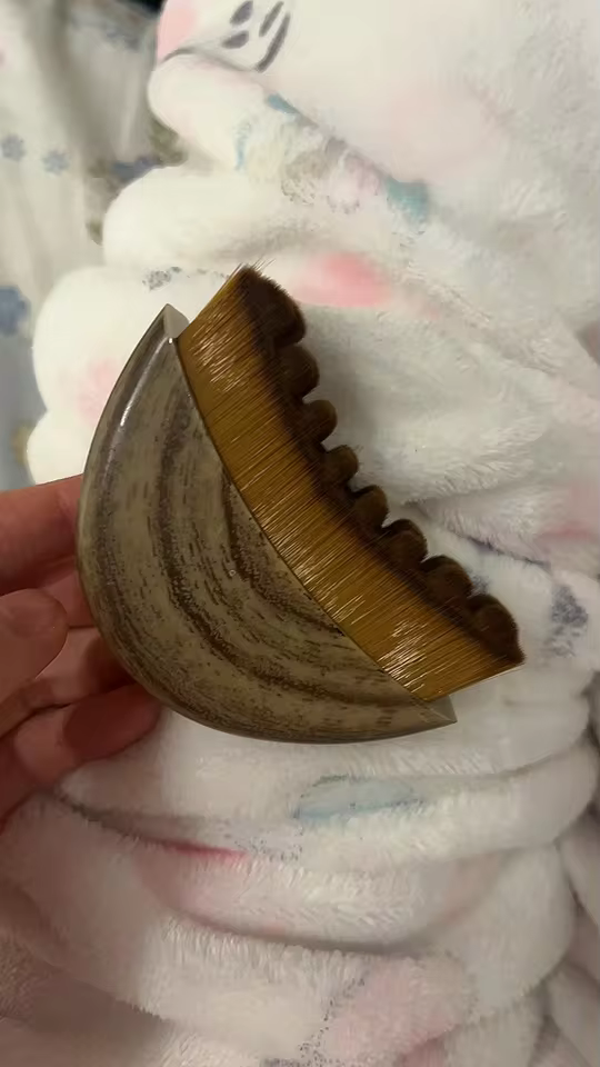 Il est arrivé très bien emballé, dans une petite boîte pour éviter la poussière. La forme s’adapte parfaitement au visage, les poils sont très doux, c’est plus pour un massage facial. Belle couleur des poils